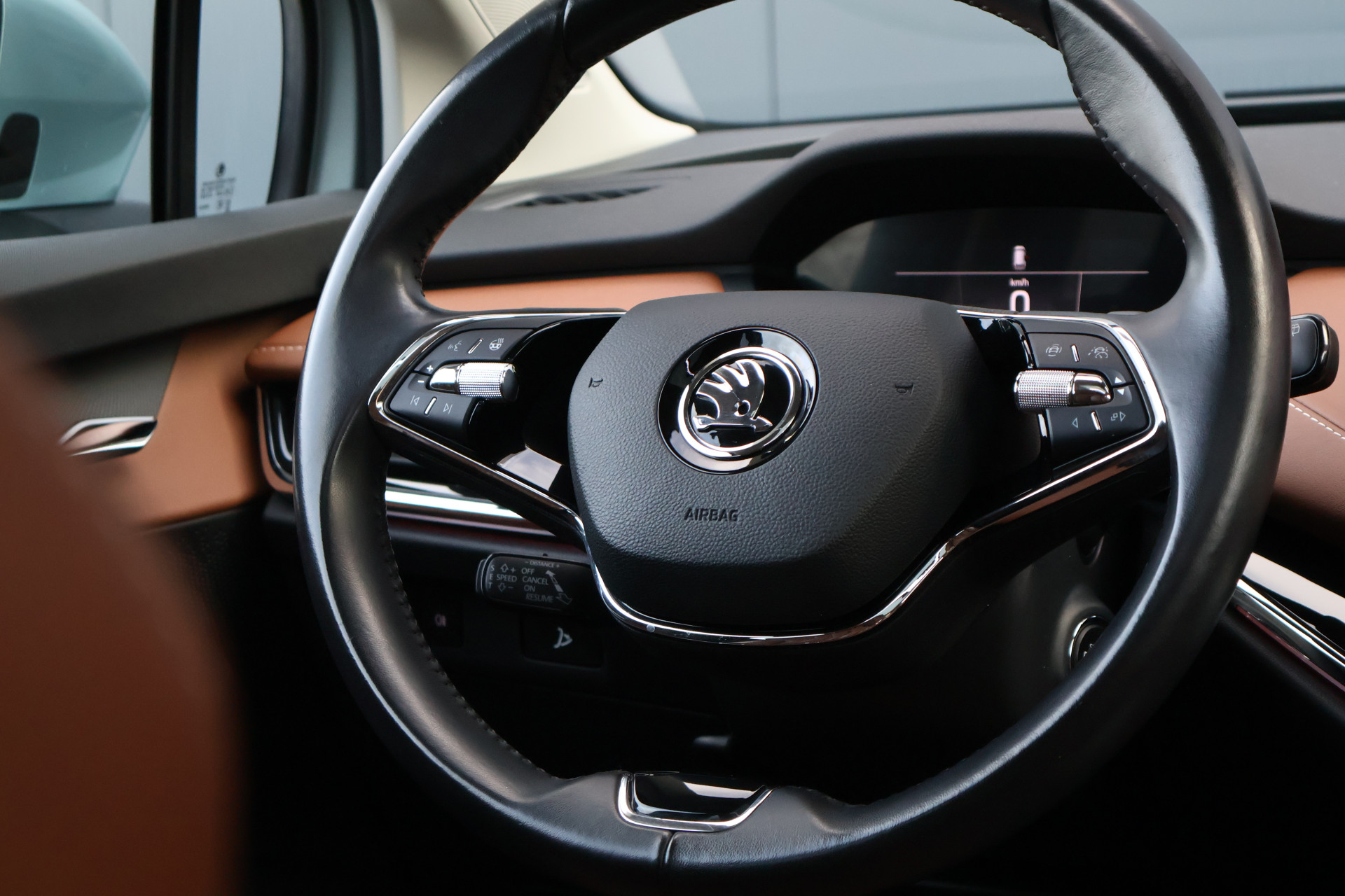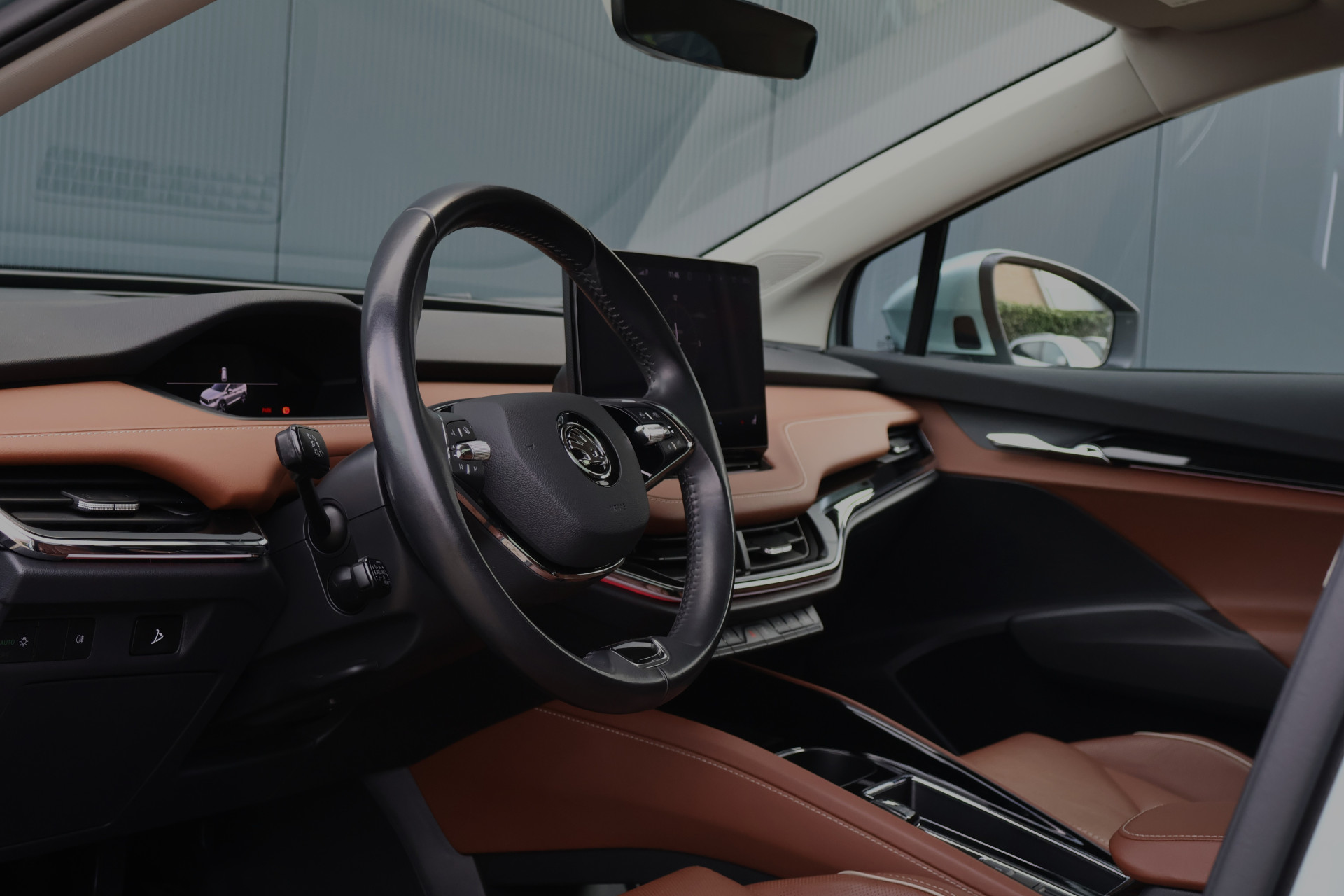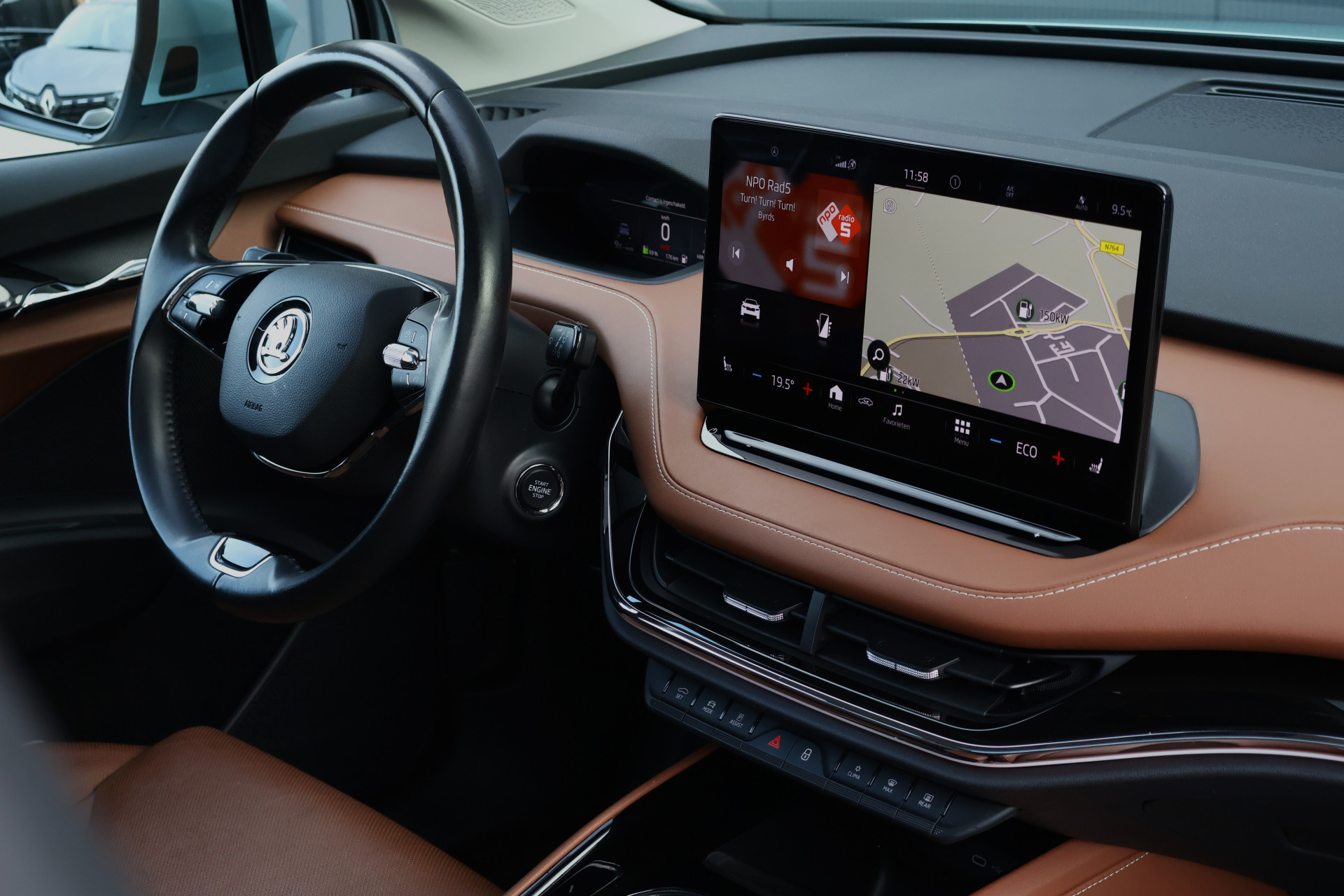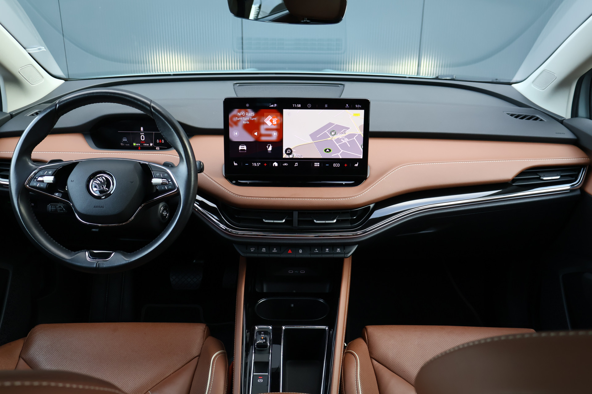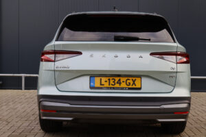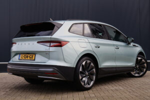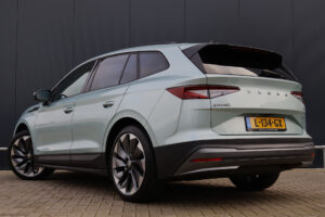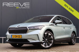 Hier staat een prachtig uitgevoerde en in zeer nette staat verkerende Skoda Enyaq iV! Deze stoere Enyaq is origineel Nederlands en uiteraard afkomstig van zijn 1e eigenaar. Zijn interieur is voorzien van chique cognac lederen stoelen met stoelverwarming (voor + achter) én een verwarmd stuurwiel. Daarnaast is hij voorzien van adaptieve cruise control, achteruitrijcamera, getint glas, 21 inch "supernova" lichtmetaal, een panoramadak én een elektrisch wegklapbare trekhaak!